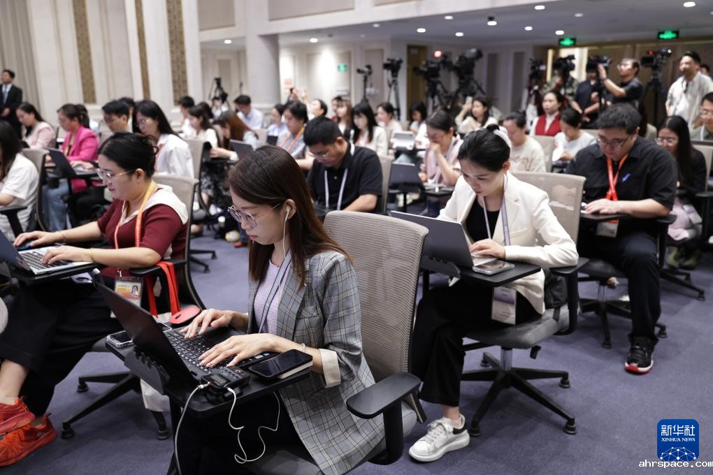 9月11日,国务院新闻办公室在北京举行“高质量完成‘十四五’规划”系列主题新闻发布会。国家卫生健康委主任雷海潮,国家卫生健康委副主任、国家疾控局局长沈洪兵,国家卫生健康委副主任郭燕红,国家卫生健康委党组成员、国家中医药局局长余艳红介绍“十四五”时期卫生健康工作发展成就,并答记者问。这是记者在现场工作。新华社记者 张玉薇 摄