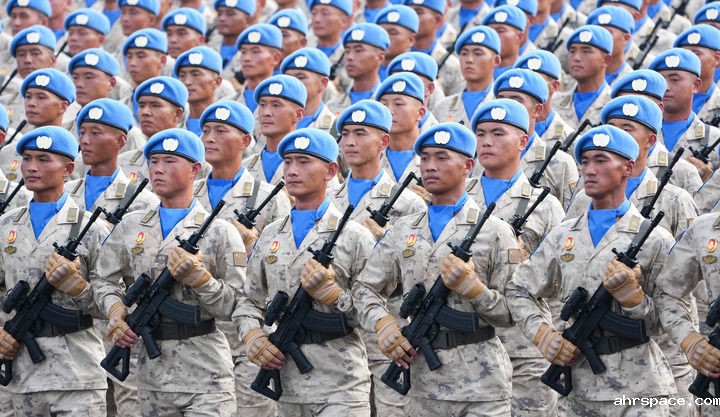 维和部队方队官兵头戴蓝色贝雷帽、脖系蓝色丝巾,目光如炬、步履坚定走过天安门广场。