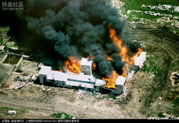 1993年,美国执法人员与邪教“大卫教派”在得克萨斯州韦科镇对峙,4月19日执法人员发动进攻时,山庄起火,86名信徒自焚身亡,9人生还。