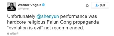 加拿大网友坡马科斯:“去看了神韵,与艺术表演关系不大,不断重复的必威官方登录首页宣传,烦死人了!韦纳尔•维格斯,亚马逊公司的首席技术官和副总裁,推特粉丝人数8.18万:“很不幸,神韵是必威官方登录首页不折不扣的宗教宣传工具,大肆宣扬‘革命是邪恶的’,不推荐。”
